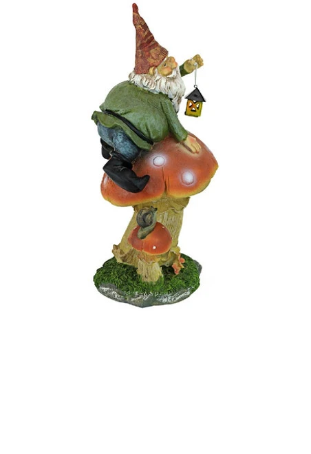 This garden gnome is sitting on top of a mushroom holding up a lantern