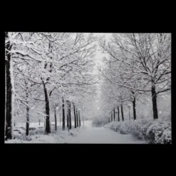 Features smiling snowmen and holiday gifts in front of a glowing tree