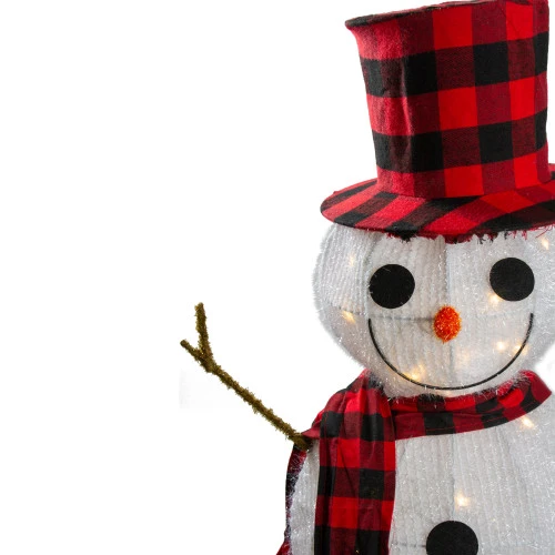 - Snowman is wearing a matching plaid top hat and scarf